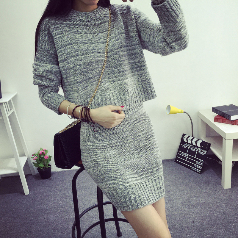 韓國(guó)代購(gòu)秋冬季女新款拼接針織毛衣包臀裙子連衣裙兩件套套裝 /