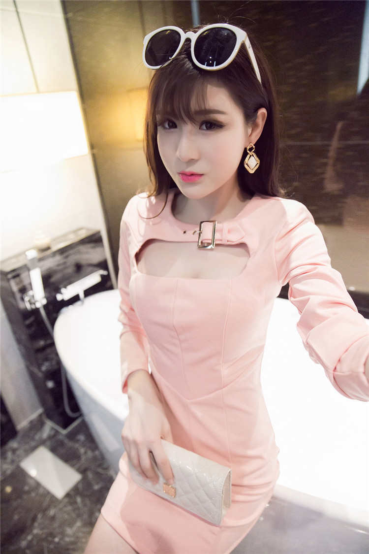 2015新品 氣質(zhì)低胸鏤空修身包臀長(zhǎng)袖修身連衣裙 百搭打底短裙5393 /
