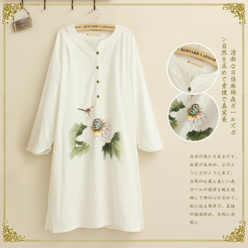 麥穗原創(chuàng)棉麻新款森系復(fù)古仿手繪印花麻皺圓領(lǐng)長袖長款女士連衣裙 /