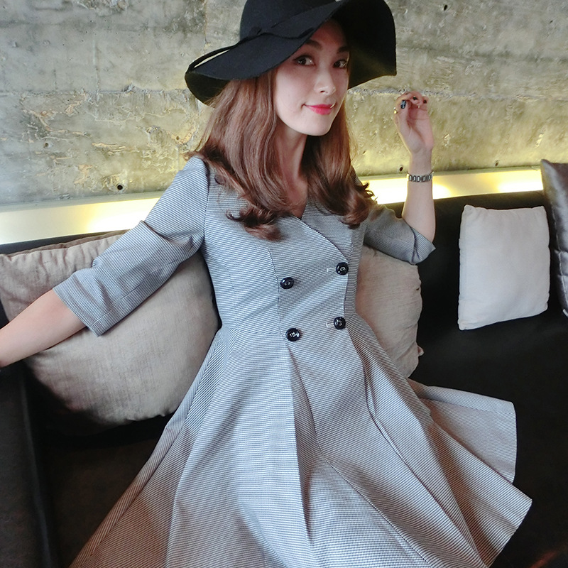 2016早春新款 赫本風(fēng)經(jīng)典款黑白千鳥格雙排扣收腰連衣裙大擺裙 /