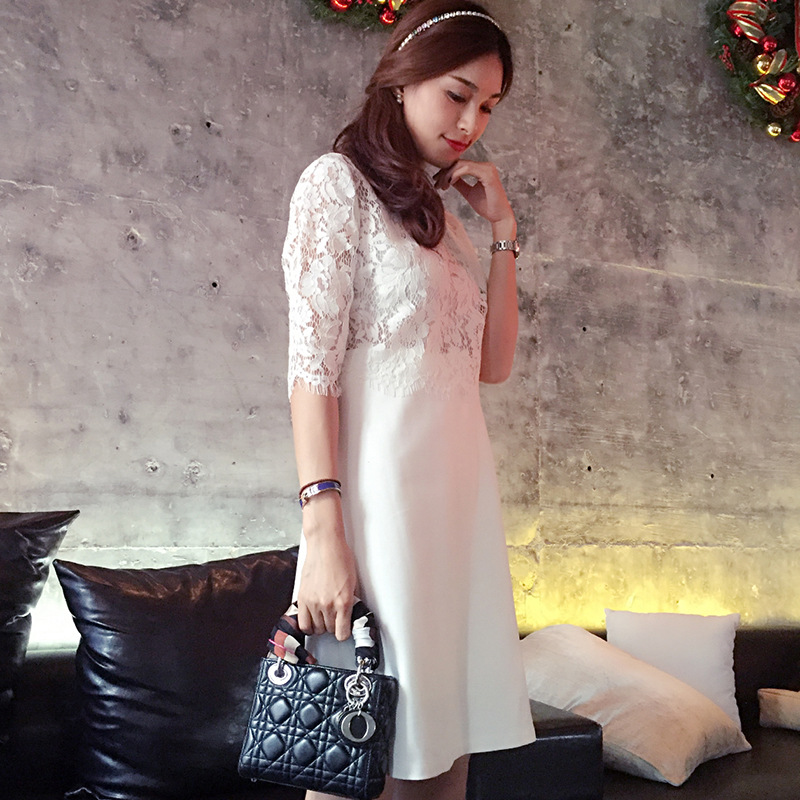 2016早春新款女裝 名媛風(fēng)修身蕾絲拼接連衣裙a字裙中長裙 /