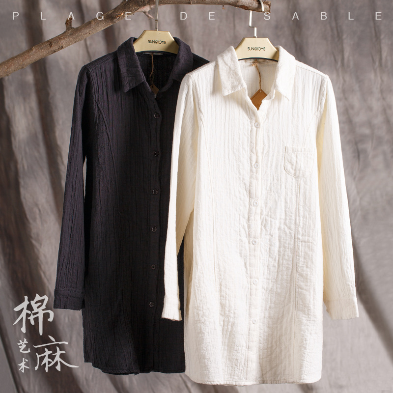 棉麻女裝品牌 原創(chuàng)森女開衫 大碼純色長款襯衫 女式上衣 /