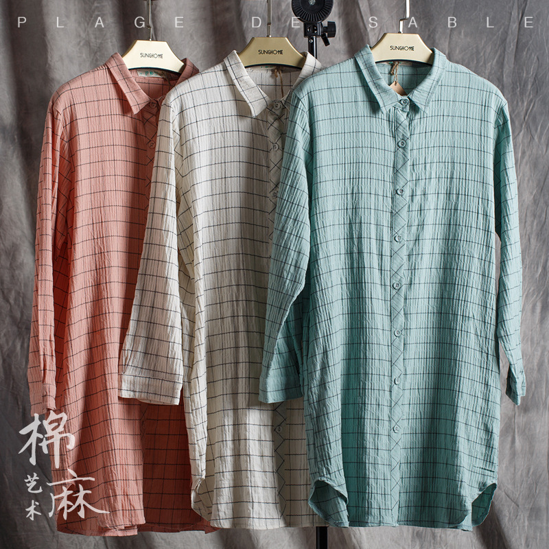文藝范襯衫 棉麻女裝原創(chuàng)棉麻開衫 經典格子長袖襯衣襯衫 /
