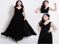 2014春季新款 收腰大擺 V領(lǐng) 低胸 純色 黑色 美妃 連衣裙女 /