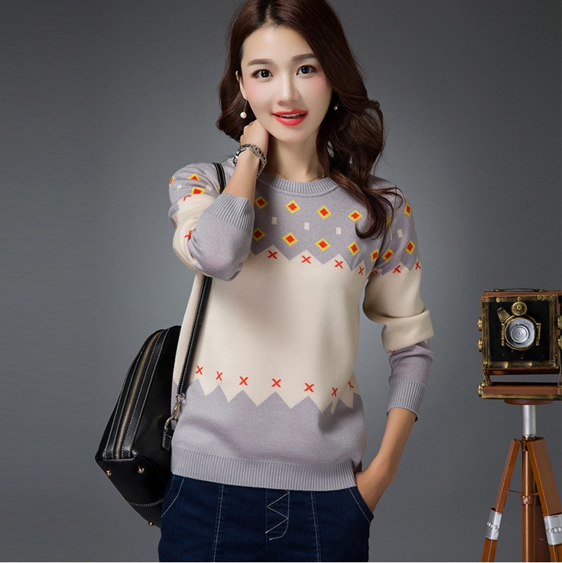 秋冬新款圓領(lǐng)套頭修身女式毛衣長袖幾何圖案打底衫批發(fā) /
