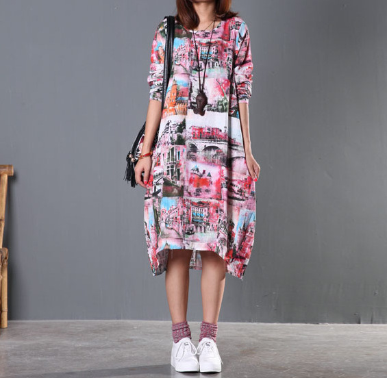 2015秋冬款棉麻大碼女裝風景畫民族風寬松長袖連衣裙 /