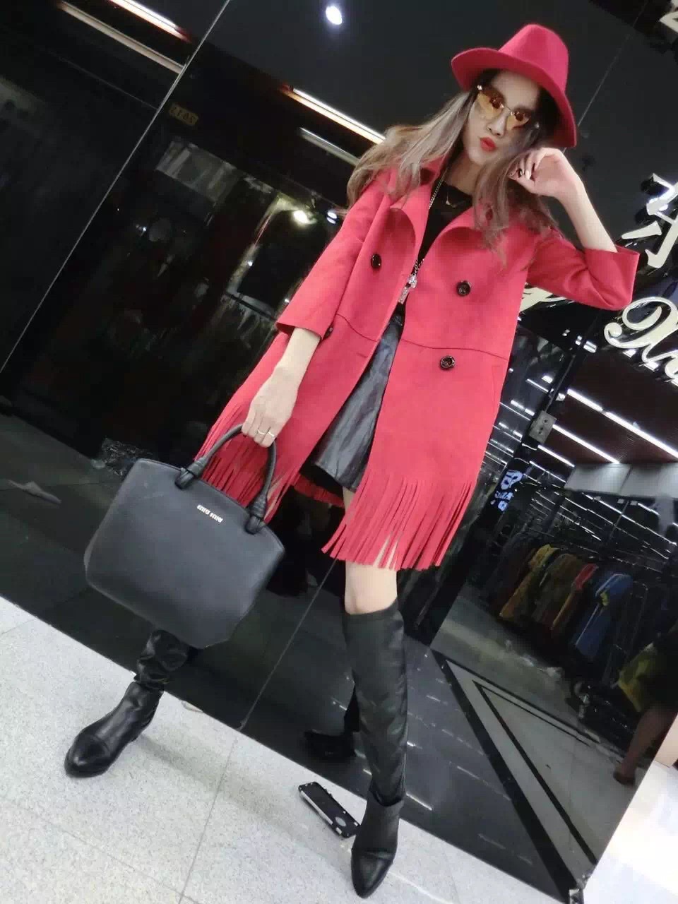 廠價直銷秋 冬韓版新款女裝女裝麂皮絨風(fēng)衣中長款時尚流蘇外套 /