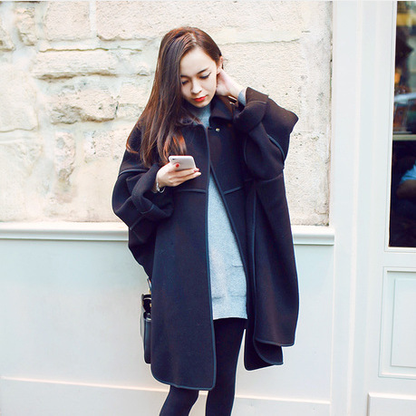2015秋冬新款呢子斗篷歐美風(fēng)蝙蝠袖毛呢外套短款寬松單排扣女 /