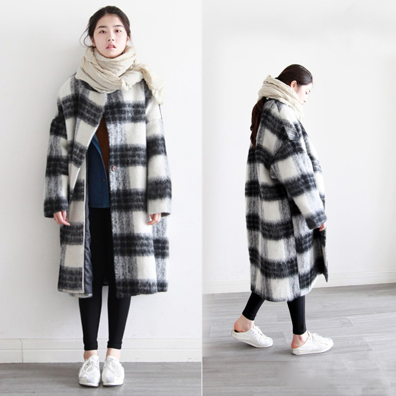 韓國代購中長款羊毛呢子黑白格子大衣翻領(lǐng)寬松大碼呢子外套女 /