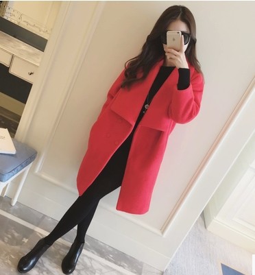 2015秋冬爆款韓版 氣質(zhì)大翻領(lǐng)寬松長款毛呢外套大衣 /