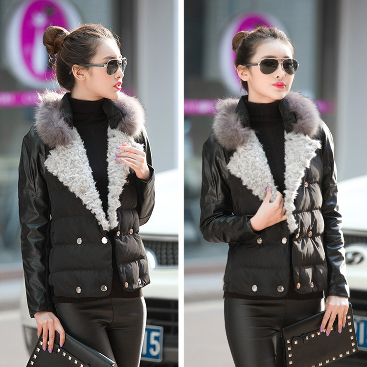 2015歐洲站冬裝新款貉子毛羊卷毛西裝領(lǐng)真皮袖羽絨服 /