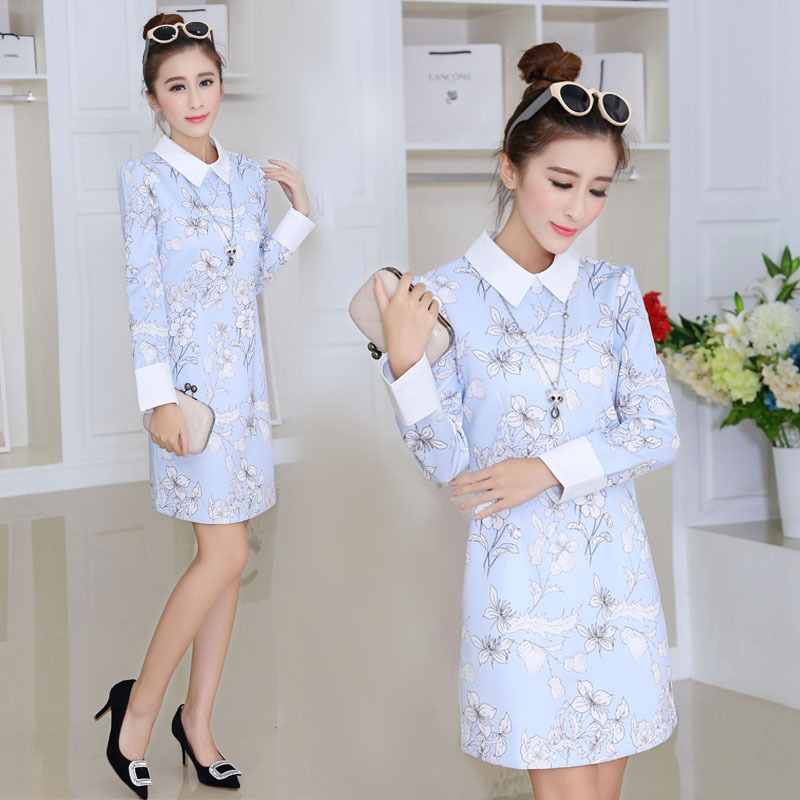 2015秋冬加厚韓版修身打底裙小翻領(lǐng)印花長(zhǎng)袖連衣裙 /