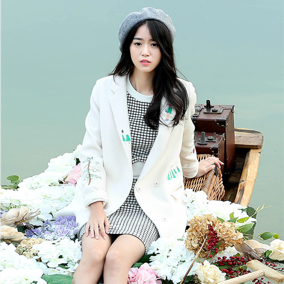 2015秋冬新款韓版中長(zhǎng)款刺繡毛呢外套毛呢大衣加棉 /