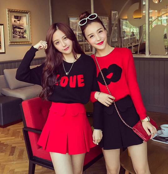 韓范閨蜜秋冬裝嘴唇字母刺繡立體顯瘦套頭毛衣打底針織衫女上衣 /