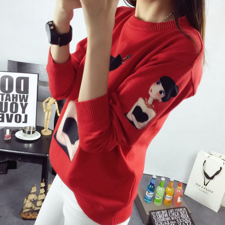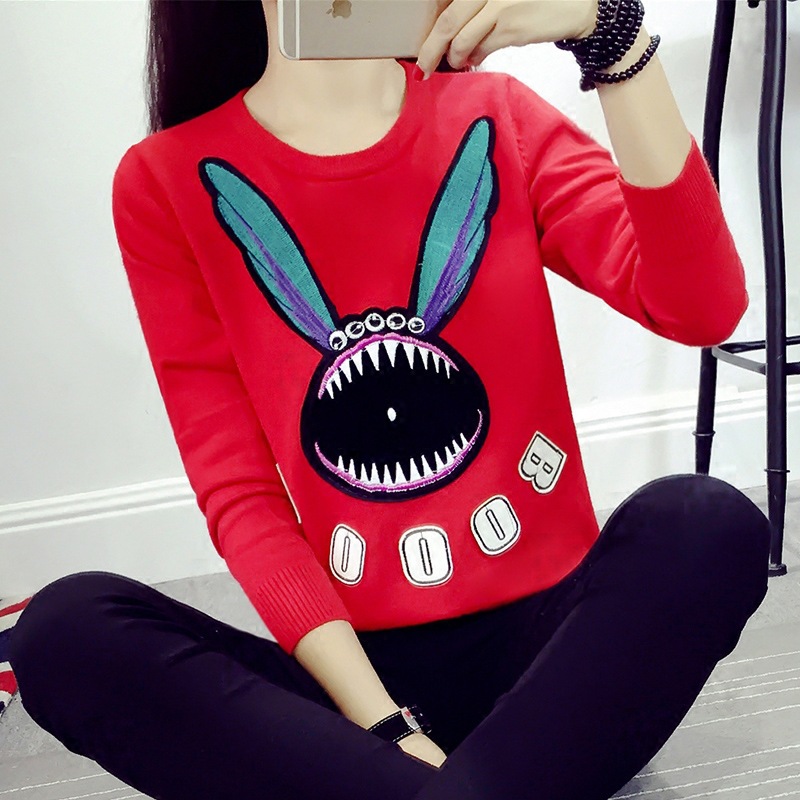 廠家包郵秋冬韓版最新款羊絨套頭圓領(lǐng)針織卡通打底衫寬松毛衣女 /