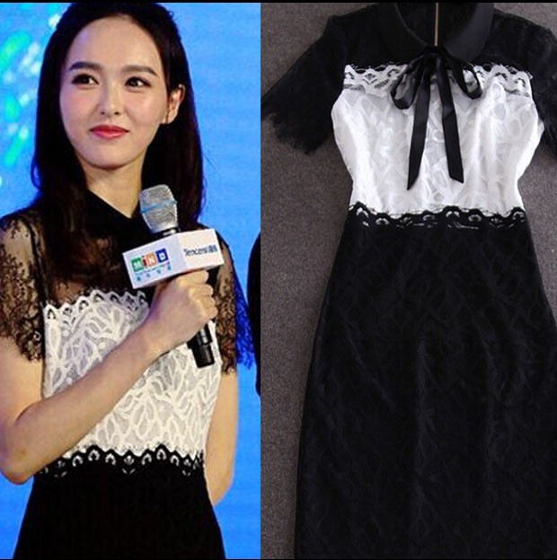 2015夏款唐嫣同款蝴蝶結(jié)睫毛蕾絲短袖連衣裙女黑白蕾絲拼色 /