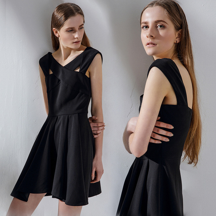 2015大牌同款名媛禮服中長(zhǎng)款夏裙露背吊帶交叉小黑裙赫本連衣裙女 /