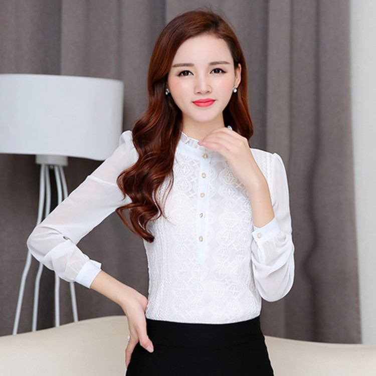 花邊立領蕾絲拼接長袖雪紡打底衫批發(fā)韓版秋冬女裝修身顯瘦上衣 /