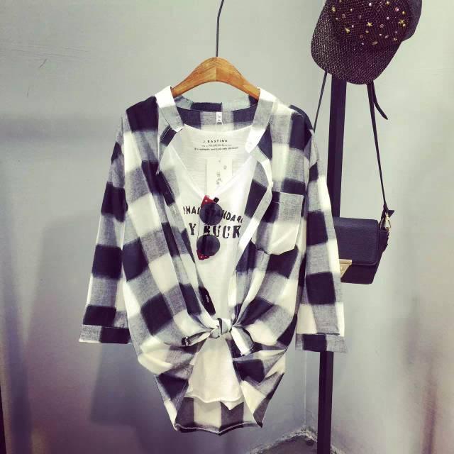 2015秋裝女韓版彩色格子寬松拼色格紋立領(lǐng)七分袖襯衣薄款防曬衫 /