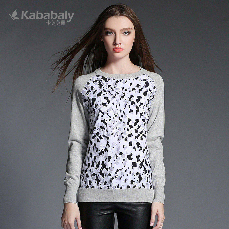 豹紋拼接針織衫女裝批發(fā)2015秋裝歐美新款修身圓領(lǐng)薄款長袖針織衫 /