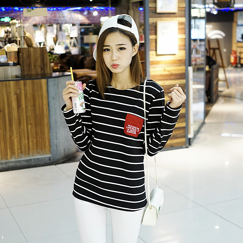 實拍大碼女裝條紋t恤口袋女加絨加厚長袖修身純棉韓版女款打底衫 /