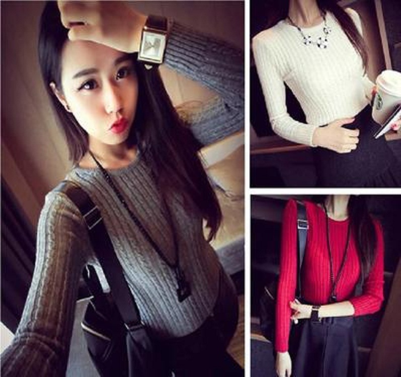 2015秋裝韓版新款時尚純色百搭圓領修身螺紋針織衫批發(fā)廠家直銷 /