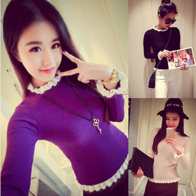 2015 秋冬新款韓范甜美木耳花邊氣質顯瘦打底針織衫女式批發(fā) /