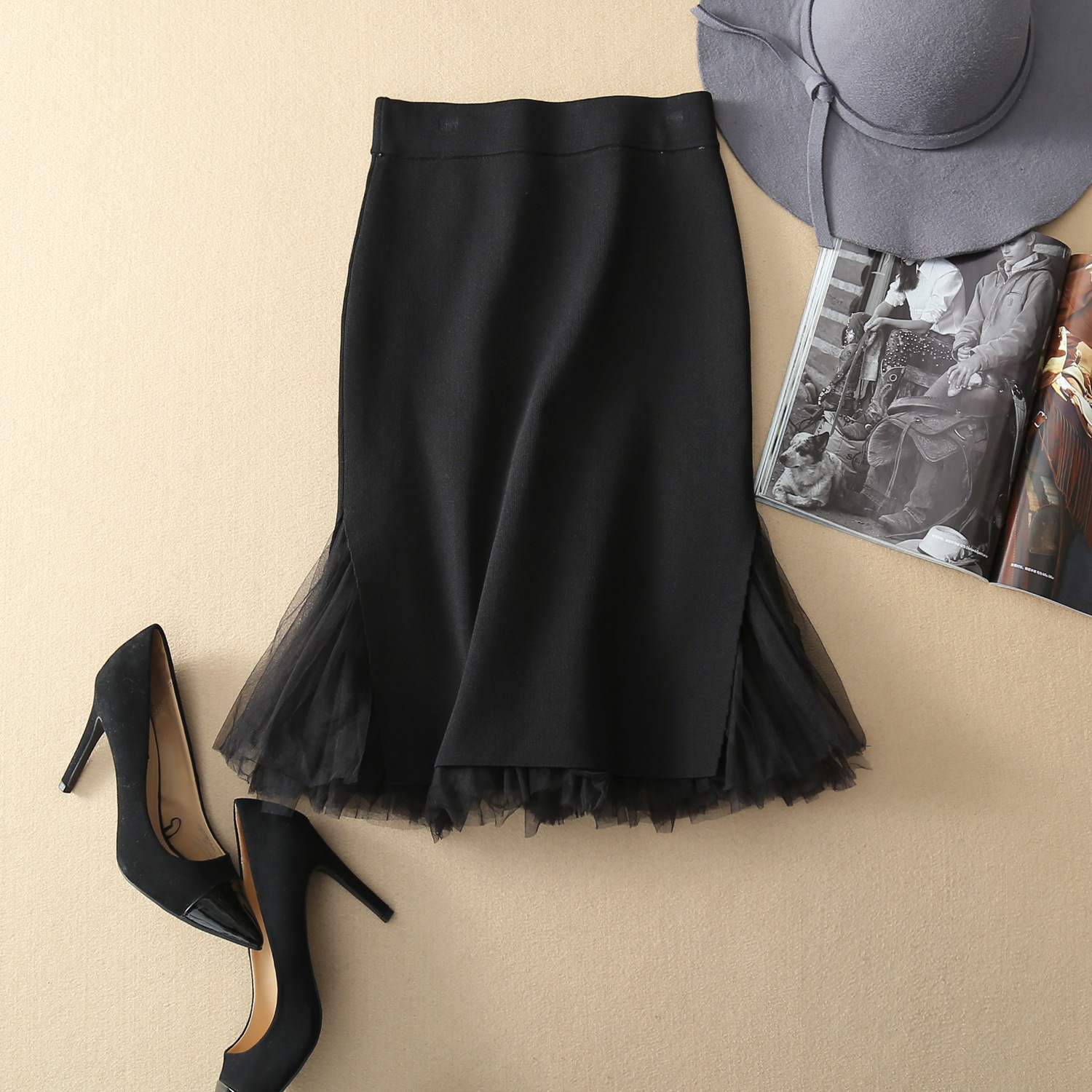 2015秋冬新款魚尾包臀裙納米絲針織網(wǎng)紗拼接半身裙一步裙 /