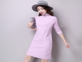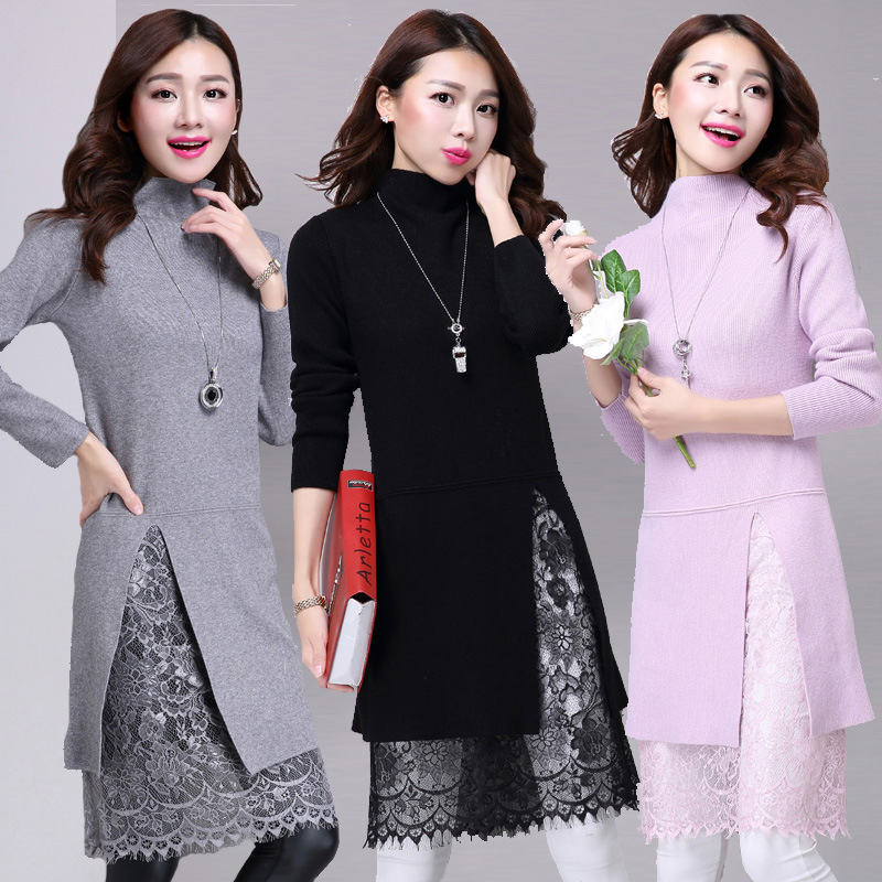 冬季新款針織連蕾絲連衣裙半高領(lǐng)毛衣中長款修身純色打底羊毛衫女 /