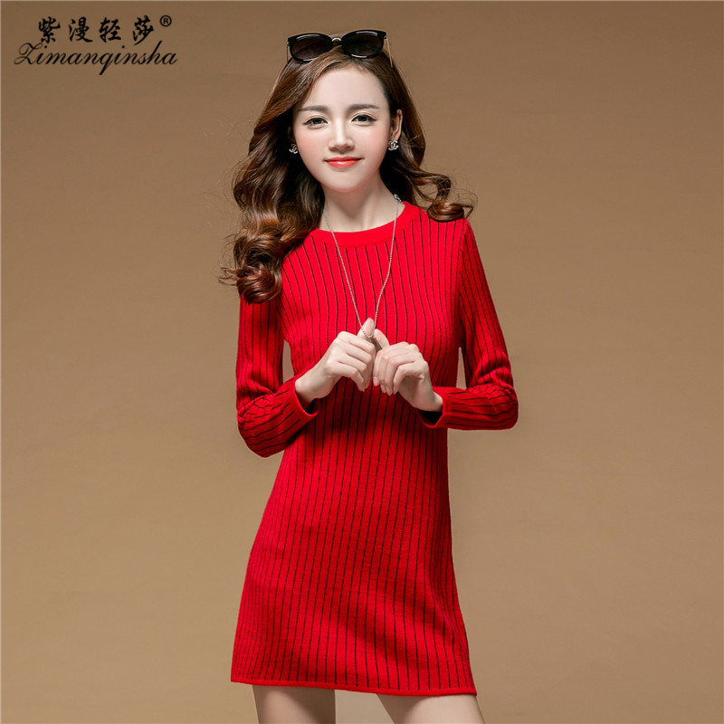 2015年秋冬女式中長款羊毛針織衫 韓版條紋圓領針織羊毛衫毛衣女 /