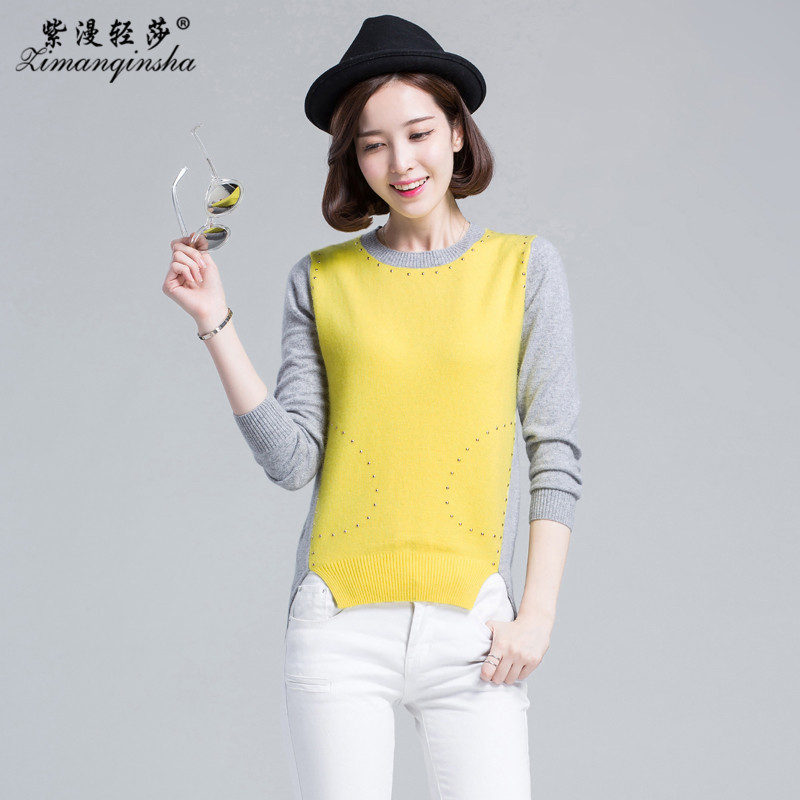 拼色圓領長袖下擺分叉修身時尚精品秋冬韓版潮流女式羊毛套頭衫 /