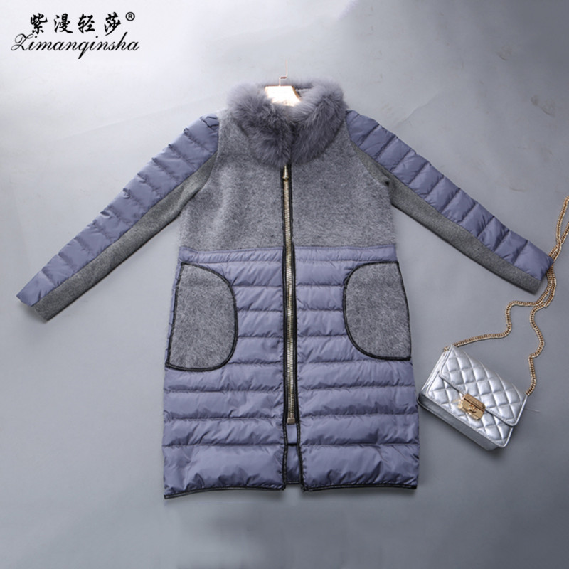 2015冬季新款韓版潮流時尚毛領拼接長袖中長款加厚羽絨服 批發(fā) /