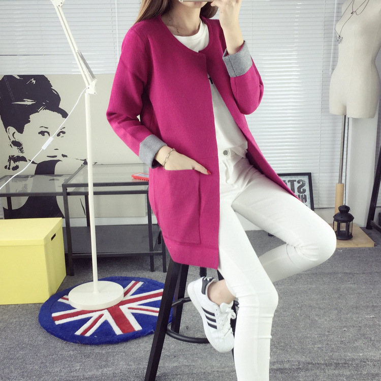 2015新款女裝純色中長款毛衣外套袖子拼色大口袋針織外套開衫批發(fā) /