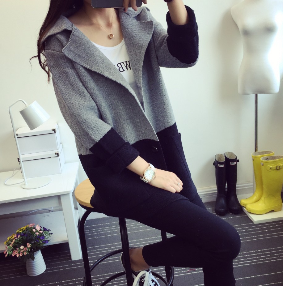 2117實(shí)拍2015秋季新款拼色西裝領(lǐng)女裝針織衫開衫 /