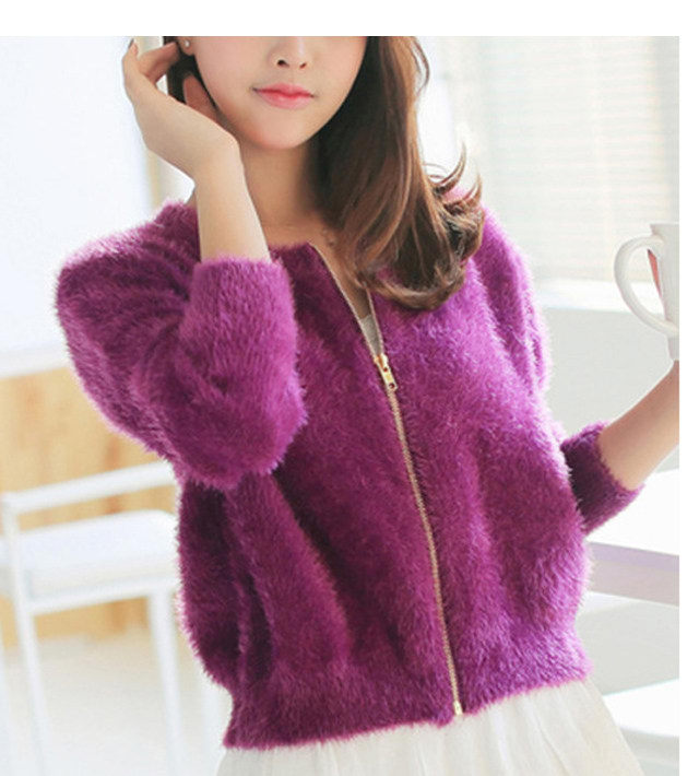 2015秋裝女新款 韓版馬海毛拉鏈短款圓領(lǐng)女式針織衫毛衣開衫外套 /