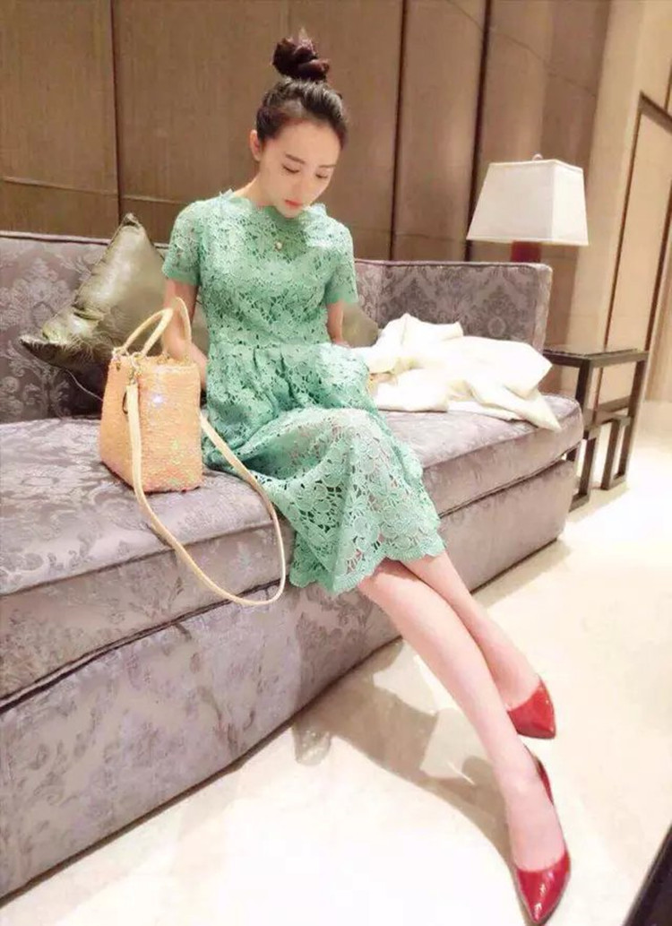 2015夏新款女裝韓名媛高端水溶薄荷綠蕾絲鏤空長(zhǎng)款高檔氣質(zhì)連衣裙 /