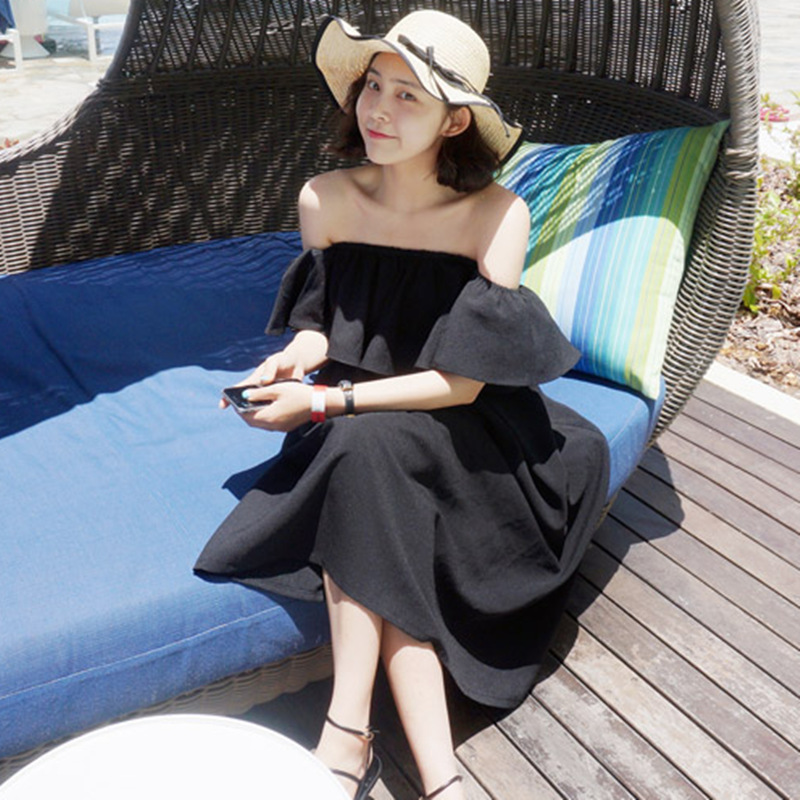 2015韓版女裝 荷葉邊性感一字露肩兩穿沙灘度假時(shí)尚休閑連衣裙 /