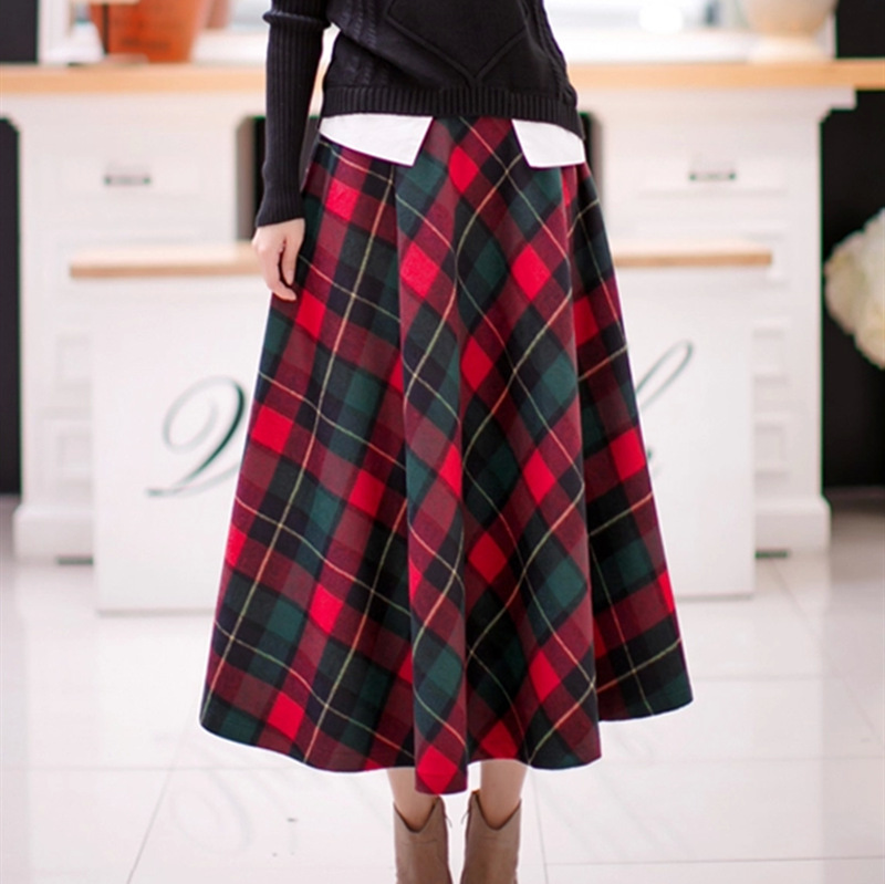 英倫風(fēng)新款秋冬女文藝復(fù)古羊毛呢格子長裙大擺A字裙 1件起批 /