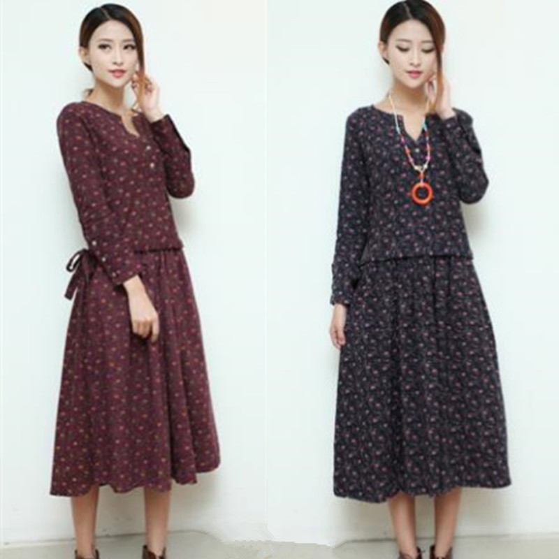 秋款女裝新款森女系V領(lǐng)碎花棉麻連衣裙布衣長裙 1件起批 /