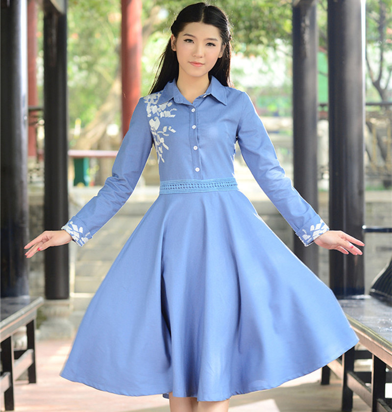 秋冬新品甜美女裝繡花棉麻修身大擺長裙襯衣領(lǐng)收腰連衣裙 1件起批 /