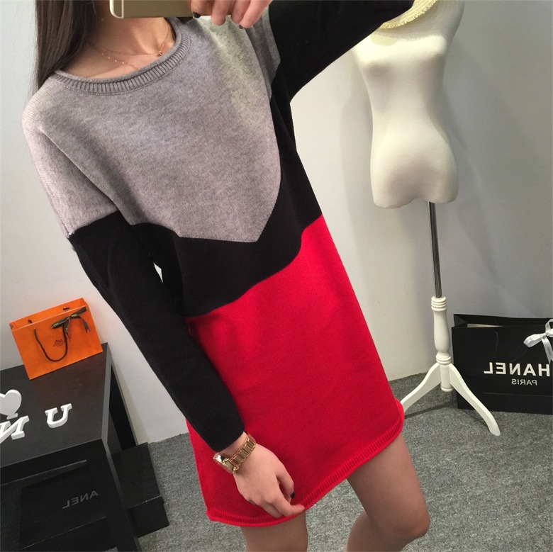 2015新款韓版冬季女裝卷邊圓領中長款拼色流蘇針織毛衣廠家批發(fā) /