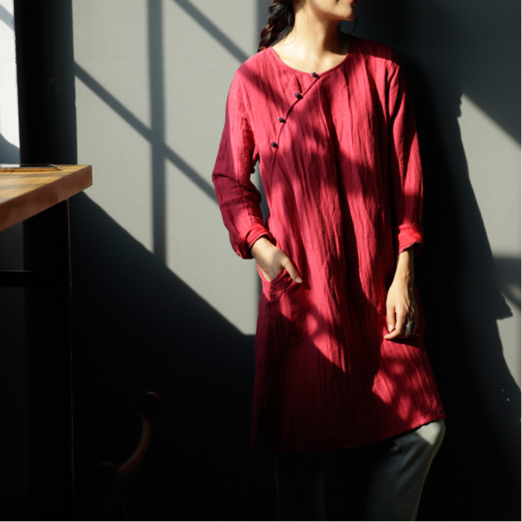 2015秋裝新款麻棉女手工盤扣斜襟改良旗袍連衣裙復古文藝長袖袍子 /