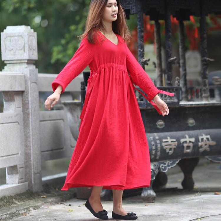 春秋裝新款長袖棉麻連衣裙森女系V領高腰系帶漢服連衣裙純色大紅 /