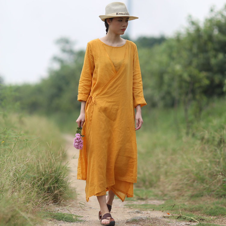 春秋裝新款女原創(chuàng)苧麻兩側(cè)系帶雙層寬松大碼連衣裙僧袍子禪服文藝 /