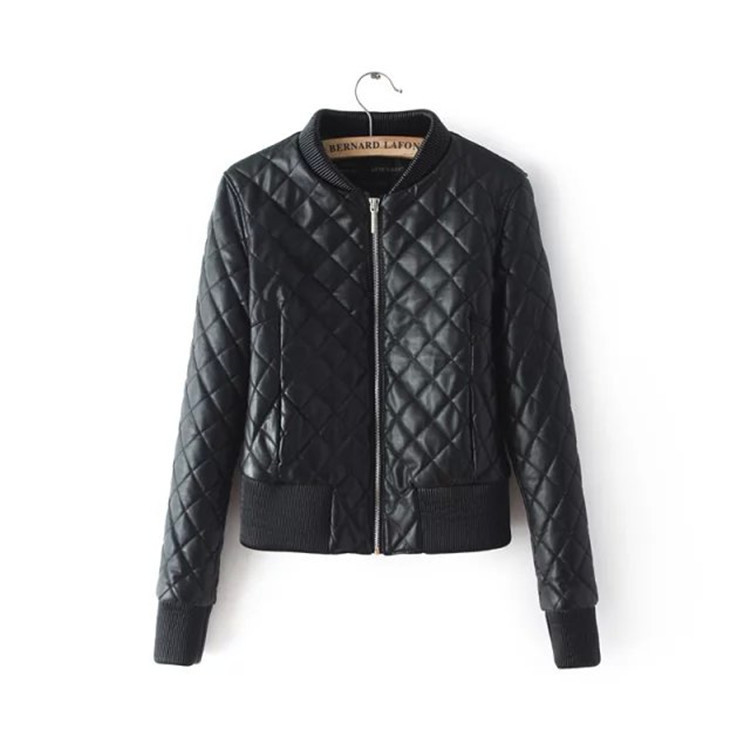 歐洲站2015冬季女裝新款外套 立領(lǐng)純色菱形褶裥加厚修身PU皮衣 女 /