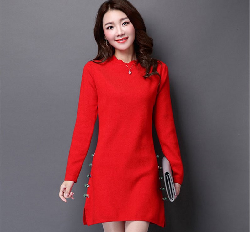 秋冬新款修身打底旗袍針織連衣裙女加厚中長(zhǎng)款毛衣裙針織衫 /
