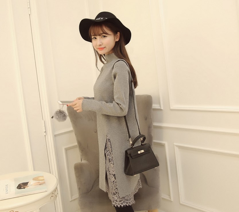 秋冬新款蕾絲拼接開(kāi)叉中長(zhǎng)款打底針織衫女毛衣顯瘦連衣裙 /