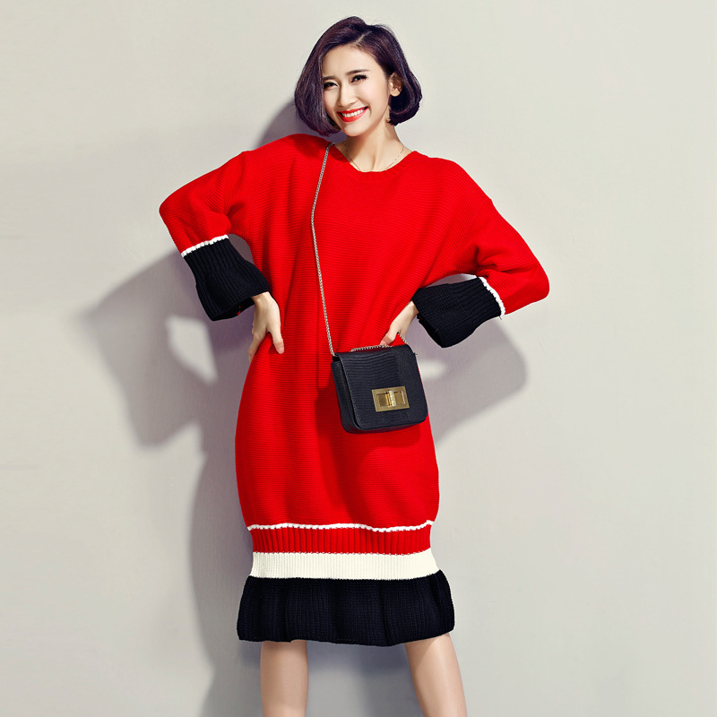 秋冬新款大碼女裝韓版長(zhǎng)袖中長(zhǎng)款半高領(lǐng)荷葉邊打底裙連衣裙毛衣 /