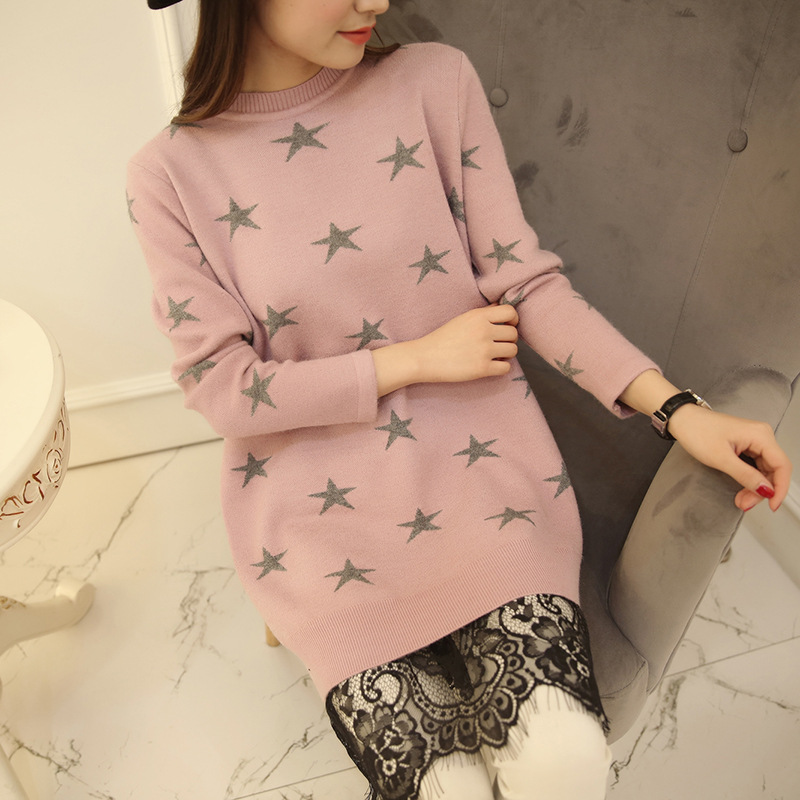2015冬季新款韓版蕾絲拼接五角星圖案百搭中長(zhǎng)款毛衣女加厚批發(fā) /
