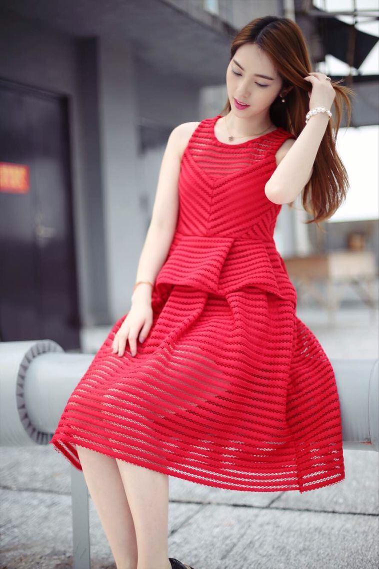 2015春夏紅色透視條紋上衣+鏤空高腰復(fù)古百褶蓬蓬裙套裝現(xiàn)貨 /